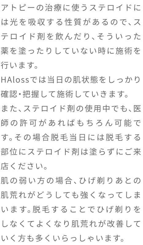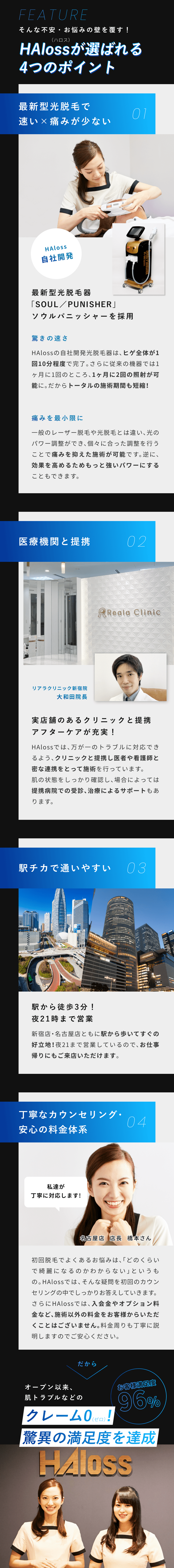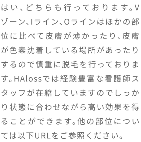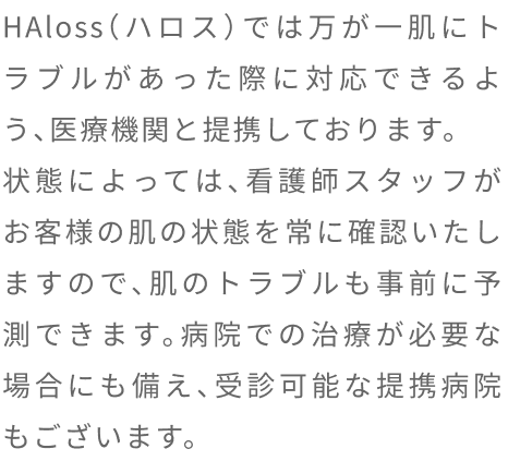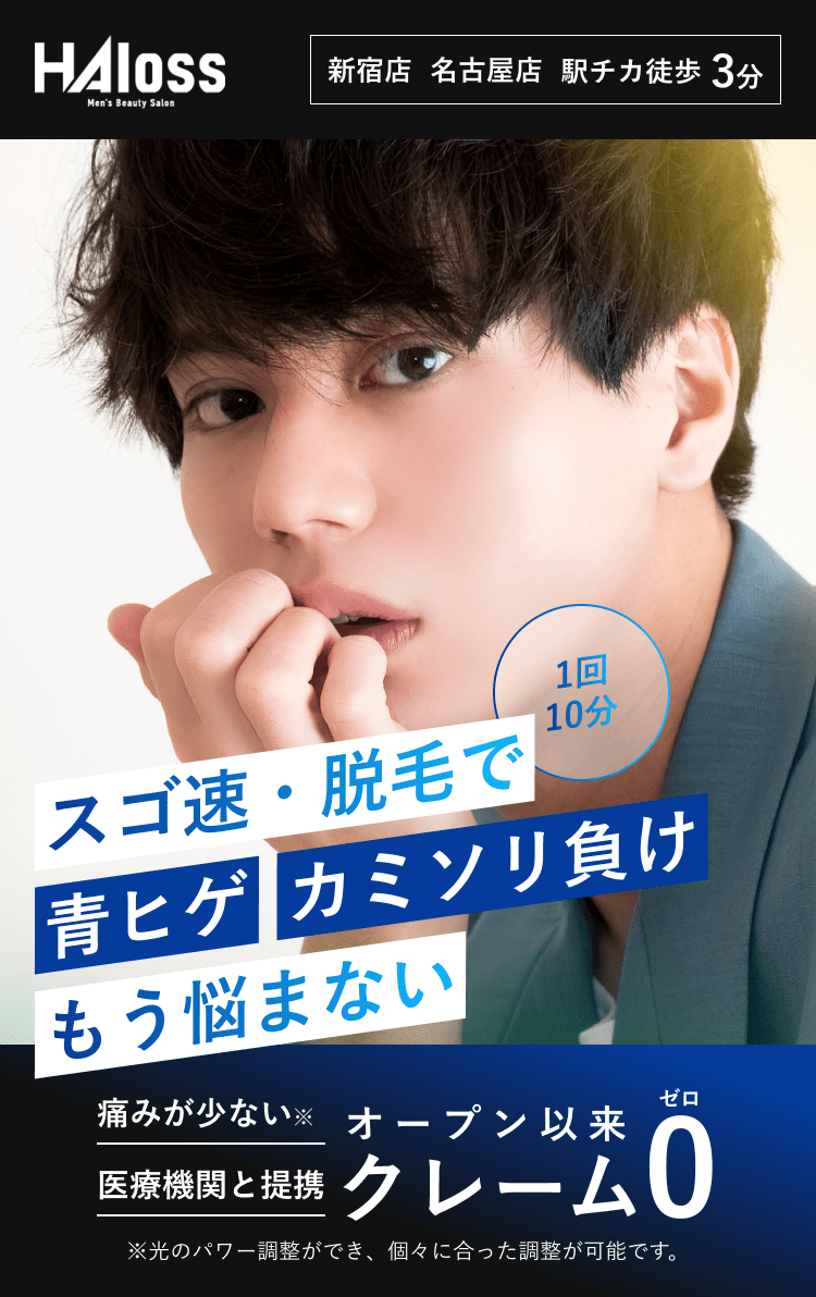 脱毛体験お申し込みフォーム 希望店舗選択必須 新宿店 名古屋本店 お名前必須 氏名 ふりがな 年齢必須 歳 メールアドレス必須 お電話番号必須 ご連絡の取りやすい番号をご入力ください。ハイフン「-」は不要です。 体験内容必須 オンラインカウンセリング 全顔ヒゲ脱毛 ヒゲ脱毛+VIO ヒゲ脱毛+足脱毛 第一予約希望日必須 予約時間10:00〜11:0011:00〜12:0012:00〜13:0013:00〜14:0014:00〜15:0015:00〜16:0016:00〜17:0017:00〜18:0018:00〜19:0019:00〜20:0020:00〜21:00 第二予約希望日 予約時間10:00〜11:0011:00〜12:0012:00〜13:0013:00〜14:0014:00〜15:0015:00〜16:0016:00〜17:0017:00〜18:0018:00〜19:0019:00〜20:0020:00〜21:00 第三予約希望日 予約時間10:00〜11:0011:00〜12:0012:00〜13:0013:00〜14:0014:00〜15:0015:00〜16:0016:00〜17:0017:00〜18:0018:00〜19:0019:00〜20:0020:00〜21:00 ご質問・ご要望等 個人情報保護方針 当サロンは、プライバシーを尊重すべき重要なものとして認識しており、ホームページご利用の際にご提供いただくお客さまの個人情報を慎重に取り扱い、プライバシーの保護に努めております。個人情報の取り扱いに関しては、個人情報保護方針に従っております。 1.利用目的について ・ホームページからのご予約の受付、お問い合わせに対する対応のため。・事務管理を適切に行うため。・個人情報の開示、内容の訂正、追加又は削除、利用の停止、消去及び第三者への提供の停止等の意思確認、また、その申請に対応するために利用します。※以上の目的以外で利用者さまの情報を利用する場合、利用者さまご本人に個別理由を説明し、同意を得た上で行うものといたします。ただし、緊急の場合、施術のため必要な場合等、当サロンが必要だと判断した場合は利用を優先し、後ほど説明させていただきます。 2.個人情報の第三者提供について 当サロンは、利用者さまよりお預かりした個人情報を適切に管理し、次のいずれかに該当する場合を除き、個人情報を第三者に開示、提供いたしません。 ・法令に基づく場合。 ・人の生命、身体又は財産の保護のために必要がある場合であって、本人の同意を得ることが困難な場合。 ・公衆衛生の向上又は児童の健全な育成の推進のために特に必要がある場合であって、本人の同意を得ることが困難である場合。 ・国の機関若しくは地方公共団体又はその委託を受けた者が法令の定める事務を遂行するに対して協力する必要がある場合であって、本人の同意を得ることによって当該事務の遂行に支障を及ぼすおそれがある場合。 3.セキュリティについて 個人情報保護のためのセキュリティとしてSSL(Secure Sockets Layer)というデータ暗号化技術を使用しております。 4.容易に認識出来ない方法による取得について CookieやWeb beacon等、個人情報を収集されていると容易に認識できない方法によって、利用者さまの個人情報を収集することはありません。 5.個人情報の委託について 検体、検査等のため他機関へ業務委託する場合などは、当該機関から機密保持に関する誓約書を取得し、個人情報の保護に努めます。 6.個人情報の開示、訂正、追加、削除、利用、提供の拒否について 当サロンへご提出いただいた個人情報については、開示、訂正、追加、提供の拒否等の要求が出来ます。詳しくは下記個人情報管理係までご連絡ください。 メンズ脱毛専門店 HAloss〒450-0002愛知県名古屋市中村区名駅3丁目13-31 名駅モリシタビル 9F TEL:0120-689-863 個人情報保護方針・プライバシーポリシーに同意します。